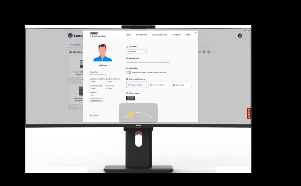Tehnologia inteligentă prezentă în noile prototipuri de ecrane Lenovo îmbunătățește productivitatea utilizatorilor și le asigură un confort sporit. Noul concept de ecran personalizat bazat pe AI oferă soluții vizuale în timp real adaptate nevoilor diverse ale utilizatorilor. Conceput ca un ecran multi-utilizator, acest concept oferă experiențe diferite în funcție de profilul utilizatorilor, ora din zi și locația geografică, adaptându-se automat la ritmul de funcționare al organismului uman pentru a oferi utilizatorilor luminozitate personalizată, temperatură optimă a culorilor și monitorizare în timp real a gradului de confort, pe baza posturii, oboselii oculare și a altor factori. Conceptul de ecran bazat pe inteligență artificială oferă un confort sporit, adaptându-se la nevoile fiecărui utilizator.