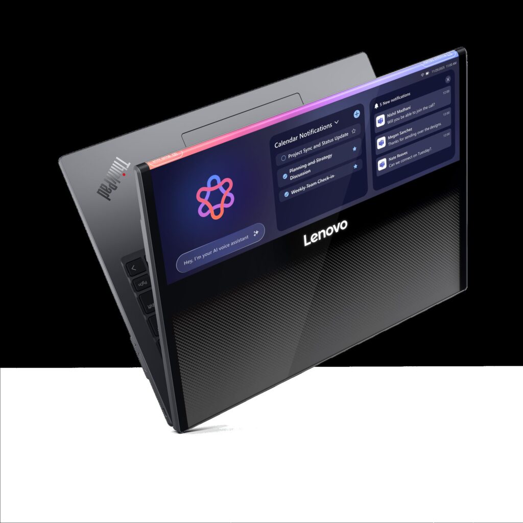 Pornind de la tradiția Lenovo în materie de design de ultimă generație pentru PC-uri, precum ThinkPad X1 Fold, primul PC pliabil din lume, și primul laptop de acest gen, ThinkBook™ Plus Gen 6 Rollable AI laptop, acest dispozitiv-concept se transformă de la un ecran compact de 13,3” la un spațiu de lucru de aproape 16”, permițând activități de multitasking în timpul deplasărilor și fluxuri de lucru potrivite cu nevoile utilizatorilor. Oferă utilizatorilor cu peste 50% mai mult spațiu pe ecran, fără să fie nevoie să transporte un notebook mai mare de 16 inci.